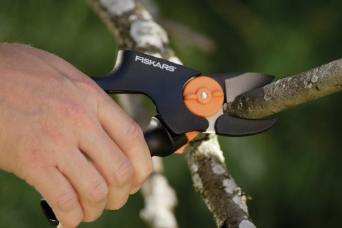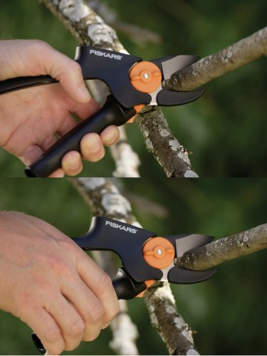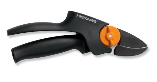The Fiskars PowerGear anvil pruner features patented PowerGear technology designed to increases your cutting power with less added effort. Intended to maximize hand strength and provide additional comfort, the pruner features a unique rotating bottom handle, and the fully-hardened stainless steel blade is replaceable. Easily cutting branches up to 3/4-inches in diameter, the pruner's blade is non-stick coated for smooth and clean cuts all-season long. This pruner is designed to fit small to medium-sized hands.