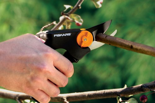 The Fiskars PowerGear bypass pruner features patented PowerGear technology designed to increases your cutting power with less added effort. Intended to maximize hand strength and provide additional comfort, the pruner features a unique rotating bottom handle, and the fully-hardened stainless steel blade is replaceable. The pruner's blade provides a cleaner cut for living, green growth of branches up to 3/4-inches in diameter. The blades also feature a non-stick coating for smooth cuts all-season long. This pruner is designed to fit small to medium-sized hands.